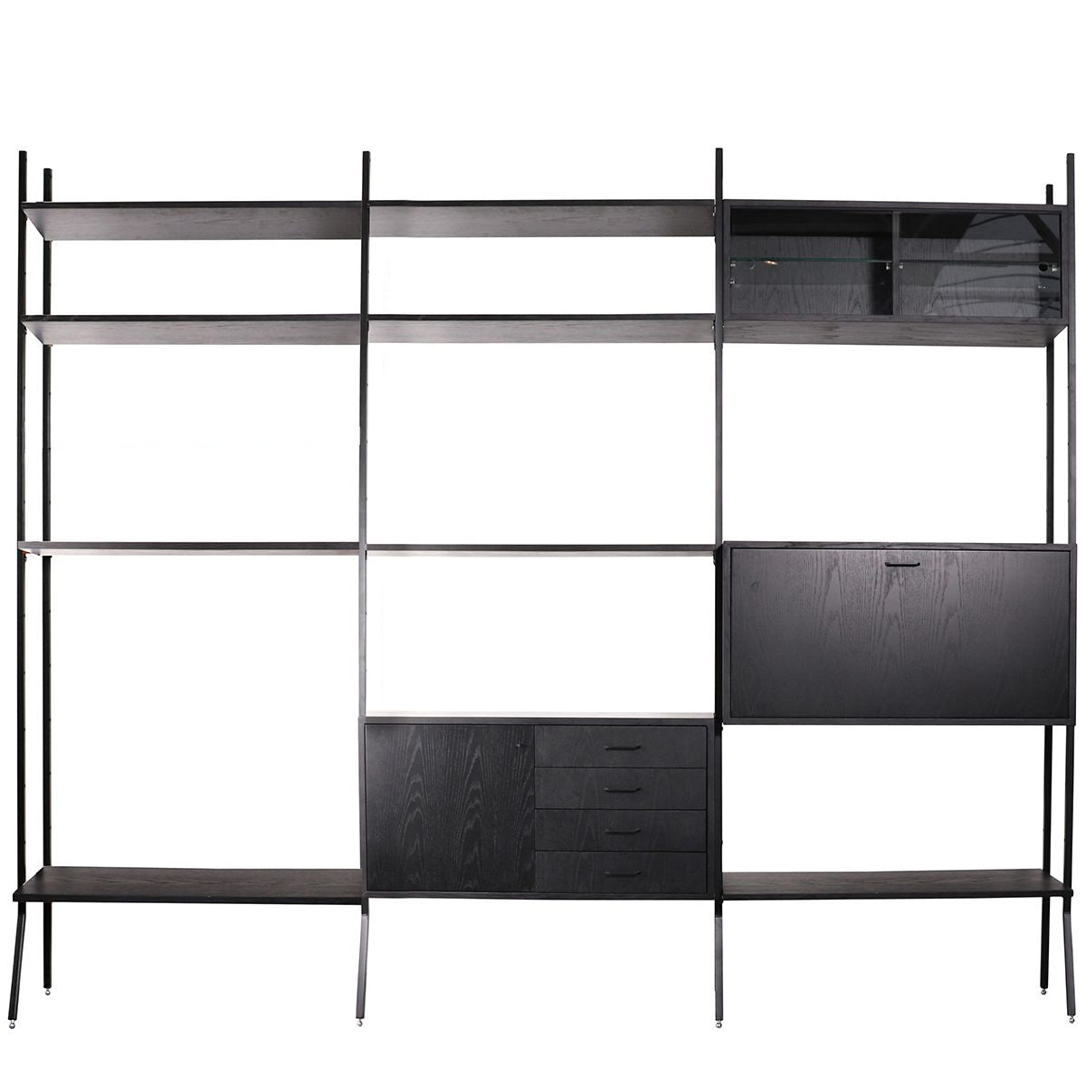 The shelving unit by Furnified is sold in the version shown. It contains 4 shelves, 1 bar cabinet with swinging door, 1 storage cabinet and 1 display cabinet with sliding glass doors. The different elements are movable, so you can put it together as you wish.