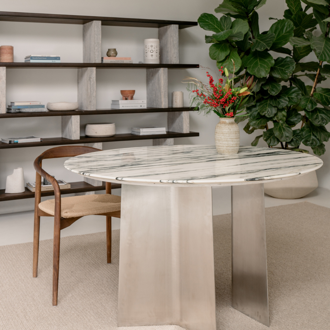 The brushed steel base gives the table a robust look and ensures stability, while adding an industrial touch to your interior. The combination of the marble with the steel makes the Tronget dining table a real eye-catcher in any dining room.