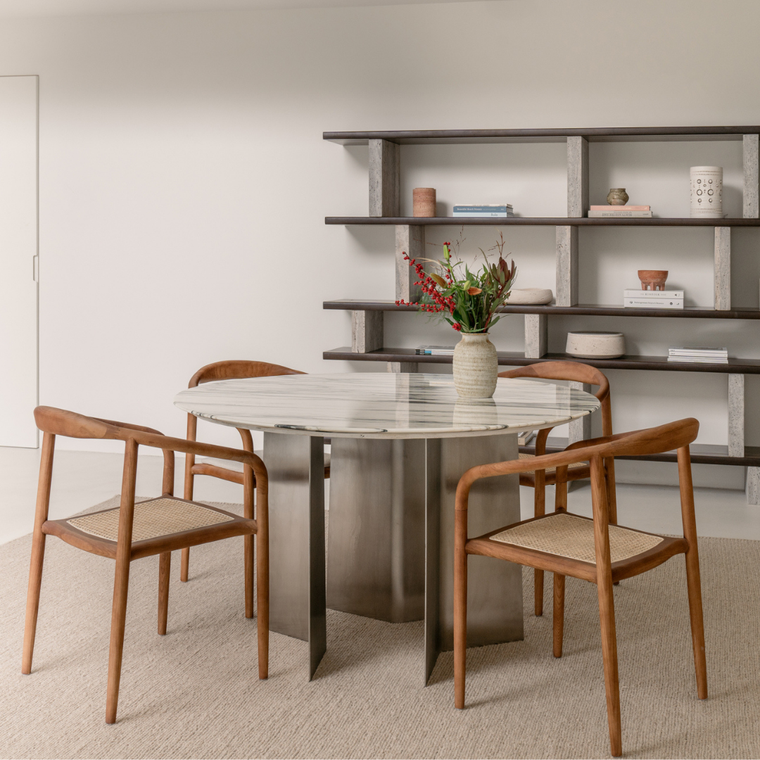 The Tronget dining table is a beautiful piece of furniture that perfectly combines modern design and luxury. With a diameter of 130 cm, this table offers enough space for cosy dinners with family and friends. The elegant blue and white marble top is not only pleasing to the eye, but also easy to maintain.